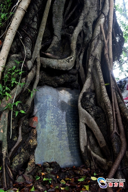 令人稱奇的是,這棵500多歲的榕樹根部,還鑲嵌著一塊古石碑,仿佛是“長”在樹跟上。據年長村民介紹,這塊石碑一開始只是放置在樹根上面,隨著樹根不斷生長,護林碑已被緊緊抱住。碑為青麻石質,高72厘米,寬48厘米。