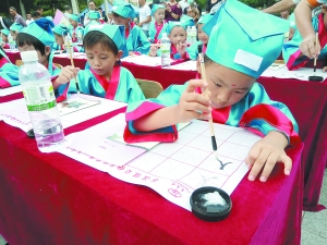 據(jù)廣州日報報道,昨日上午,江門蓬江區(qū)近500名小學一年級新生及其家長來到茅龍書院獻章堂前,舉行傳統(tǒng)的“開筆禮”暨五邑優(yōu)秀傳統(tǒng)家訓誦讀活動;顒影磦鹘y(tǒng)開筆禮儀式,舉行了正衣冠、拜先師、點朱砂、寫“人”字等儀式。
