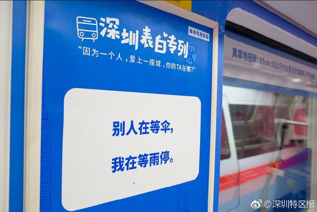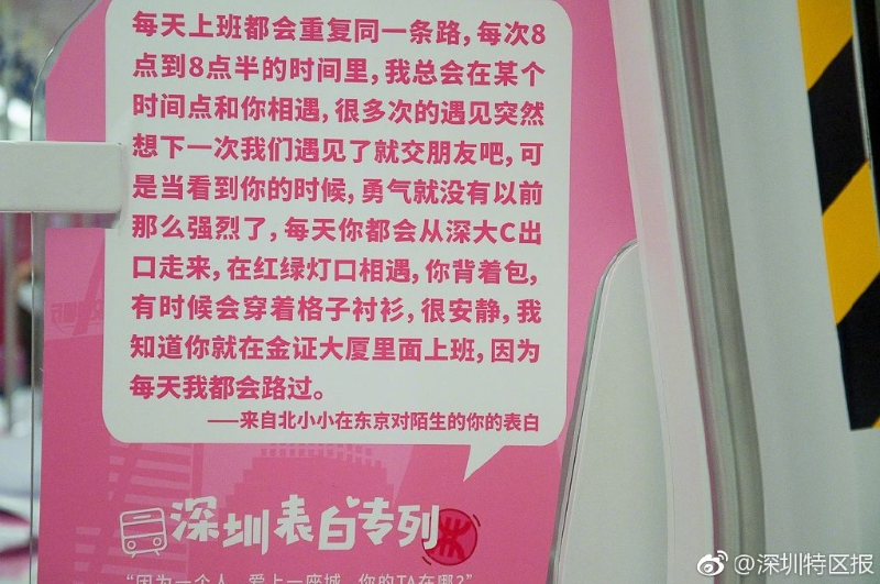 據(jù)深圳特區(qū)報報道:“同學(xué),有沒有覺得對面那位很像你下任女朋友”,近日,深圳開了地鐵表白專列,將在1號線運(yùn)行1個月,5月8號發(fā)車,每天巡回行駛,內(nèi)含單身專用車廂!上千條表白中有對喜歡的人的表白,有對父母的表白,對同學(xué)的表白。網(wǎng)友:單身車廂扎心了!
