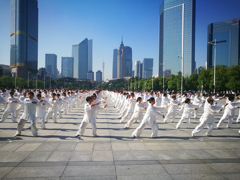 當(dāng)天上午,2017廣州千人太極展示活動(dòng)在天河體育中心南廣場(chǎng)舉行,近千名太極拳愛好者動(dòng)作整齊劃一,與宏大的天河體育中心交相輝映。
