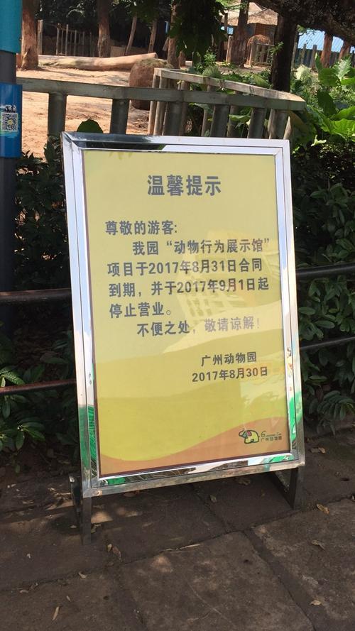 8月30日,廣州動(dòng)物園在園內(nèi)的動(dòng)物行為展示館門口張貼了通知,由于租賃合同屆滿,9月1日以后,動(dòng)物行為展示館將停止?fàn)I業(yè)。這意味著,廣州動(dòng)物園的馬戲表演將正式落幕。