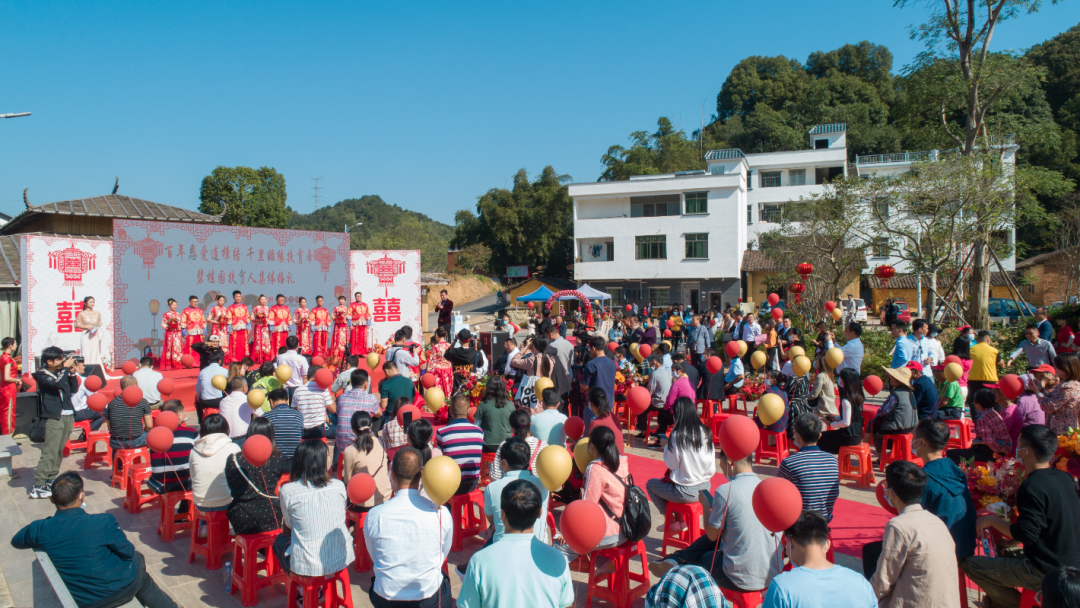 從魚咀開車一個多小時,就到了英德連江口鎮(zhèn)連樟村,6對新人在汀步觀景臺舉行了簡單的婚禮儀式。2018年習(xí)近平總書記在連樟村考察時說:“鄉(xiāng)親們一天不脫貧,我就一天放不下心來!爆F(xiàn)在的連樟村已經(jīng)大變樣了——2019年底,全村54戶131名貧困人口已經(jīng)全部達到脫貧退出標(biāo)準(zhǔn);農(nóng)家樂生意紅火,老板的拿手好菜麻竹筍炒肉片更是遠(yuǎn)近聞名。儀式當(dāng)天,國務(wù)院扶貧辦全國貧困村創(chuàng)業(yè)致富帶頭人(碧桂園連樟村)培訓(xùn)基地揭牌暨首次開班儀式在連樟村鄉(xiāng)村振興學(xué)院舉行,學(xué)院將為貧困地區(qū)培養(yǎng)出更多的創(chuàng)業(yè)致富帶頭人。