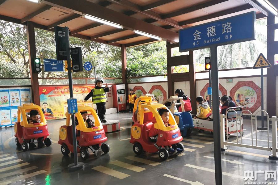 “嚴禁酒后駕駛,開車不喝酒,喝酒不開車,如果開車喝酒的話,兩個車就會一起撞到!痹谟變簣@二樓交通模擬游戲區(qū),“小交警”唐若涵打著手勢指揮著過往的小車,坐在車里的小朋友則看手勢行動,這樣很生活化的一幕就發(fā)生金穗幼兒園。