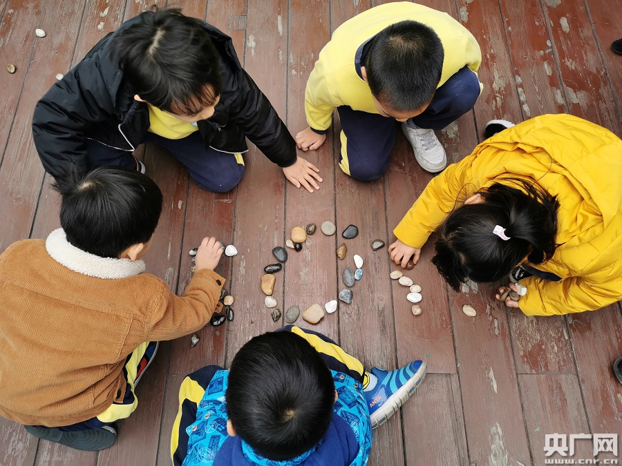 孩子們學習用石子拼出“SOS”。(央廣網(wǎng)記者 夏燕 攝)