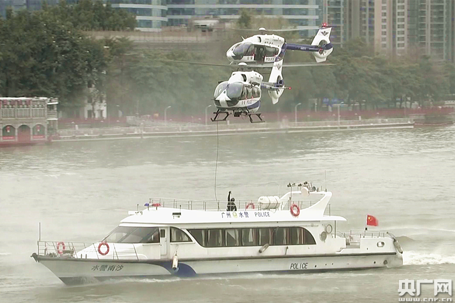 特警落船的一瞬間,博得現(xiàn)場(chǎng)觀眾的陣陣掌聲。這是廣州公安水空綜合演練的一幕,模擬珠江上一艘船艇出現(xiàn)被劫持的突發(fā)狀況,廣州特警索降安全解救人質(zhì)的場(chǎng)景。