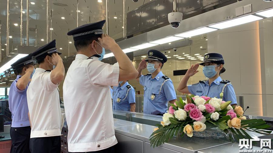 珠海邊檢總站、澳門治安警察局代表在珠澳分界線上互相敬禮、握手,開啟在橫琴口岸合作執(zhí)法執(zhí)勤的嶄新歷史(央廣網記者 陳越 攝)