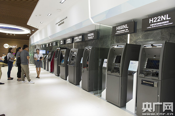 廣電運(yùn)通行政樓大廳展示著各類(lèi)功能不一的ATM機(jī)