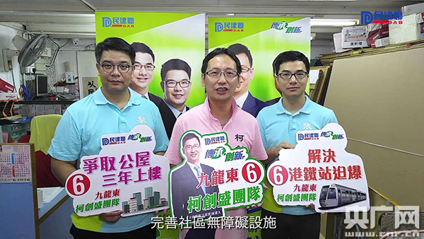 柯:其實這個口號就能很好的表現(xiàn)出兩個狀況的。第一個就是反映出民建聯(lián)是一個能夠給年輕人多點嘗試參與政治機會的政黨。我們希望通過“有年輕,有干勁”這種想法,向議會注入新的動力。讓九東的市民知道年輕人是有能力,能夠擔當起政治工作。第二句創(chuàng)新為九東,是因為九龍東面臨著很多老大難的問題,我們交通擁堵問題,長者人口多,貧窮問題嚴重,房屋問題備受關(guān)注。所以我們能夠希望通過新的思維,讓政府關(guān)注我們九龍東,所以就想到這個口號了。