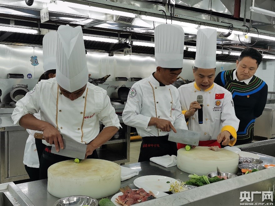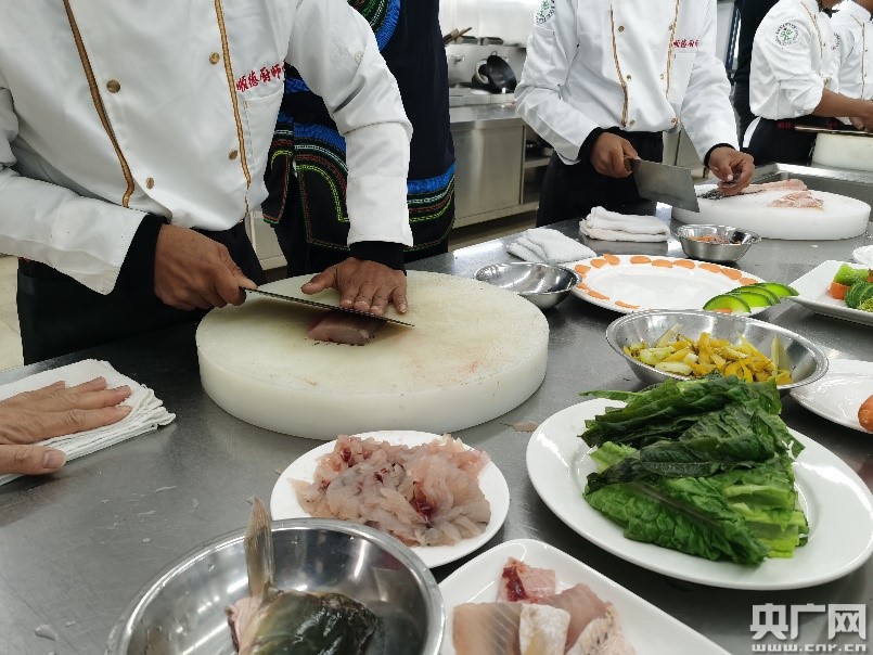 國賽選手楊東升與彝族學(xué)員同臺(tái)PK片魚刀工。(央廣網(wǎng)發(fā))