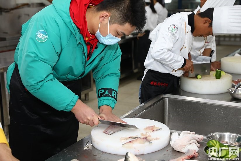 來自四川涼山班的彝族學(xué)員正在練習(xí)片魚技藝。(央廣網(wǎng)發(fā))