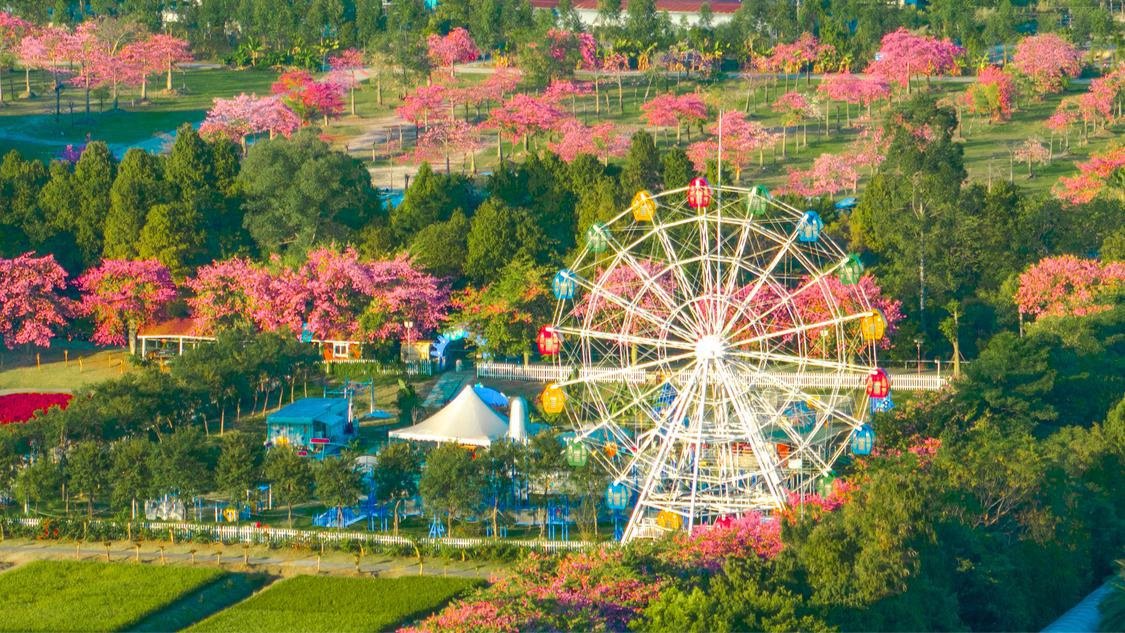 異木棉樹綻放出滿樹的粉紅花朵,如同云霞般絢爛奪目。