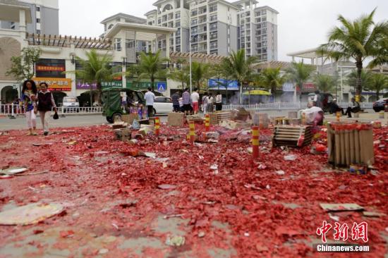 2月19日,海南省萬(wàn)寧市一小區(qū)門口堆積了大量市民在除夕夜燃放的煙花爆竹垃圾。