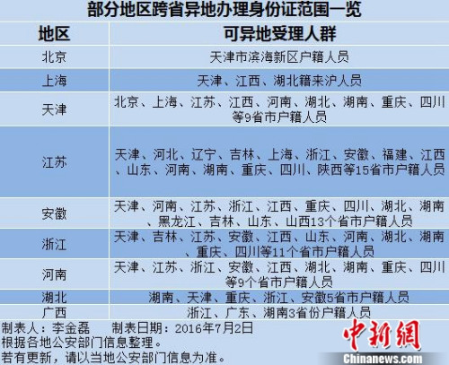中新網(wǎng)記者注意到,自7月1日起,在試點(diǎn)的基礎(chǔ)上,目前可以跨省異地辦理身份證的地區(qū)數(shù)量已經(jīng)大大增加,但每個(gè)省份明確的受理人員范圍不盡一致。