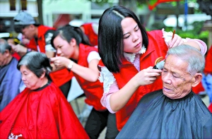 社區(qū)志愿者為老人免費剪發(fā)。廣報記者邱偉榮攝