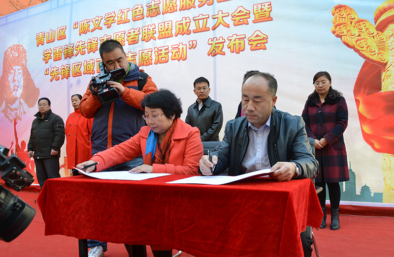 大地合唱團(tuán)紅歌聯(lián)唱拉開了活動(dòng)的序幕。云曉燕書記宣讀關(guān)于成立“陳文學(xué)紅色志愿服務(wù)工作室學(xué)雷鋒先鋒志愿聯(lián)盟”的決定。為更好依托陳文學(xué)工作室及轄區(qū)內(nèi)的志愿服務(wù)團(tuán)隊(duì),先鋒道街道黨工委根據(jù)各社區(qū)實(shí)際情況制定全年志愿服務(wù)計(jì)劃特制定了“百次志愿服務(wù)活動(dòng)”,活動(dòng)現(xiàn)場志愿者代表簽名。同時(shí),為繼承和弘揚(yáng)志愿服務(wù)精神,先鋒道街道與各高校簽訂志愿服務(wù)實(shí)習(xí)協(xié)議,為有志愿服務(wù)理想的大學(xué)生提供展示的機(jī)會(huì)和平臺(tái)。會(huì)上,最美黨員陳文學(xué)作為志愿者代表宣讀倡議書,傳遞雷鋒精神,號(hào)召更多的人加入志愿服務(wù)的隊(duì)伍,幫助別人,奉獻(xiàn)自己。
