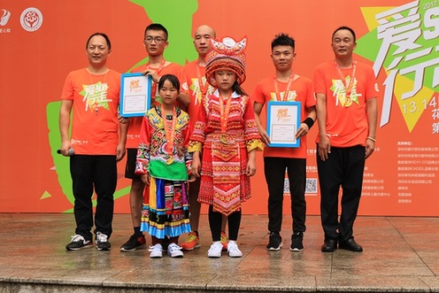 圖注:頒獎(jiǎng)合影(前排左起云南廣南縣五珠鄉(xiāng)中心小學(xué)學(xué)生劉修蘋、候重妃);后排左起(花樣盛年基金秘書長(zhǎng)謝金水、季軍洪戴威、冠軍徐龍風(fēng)、亞軍徐巖松、校長(zhǎng)陸文忠)