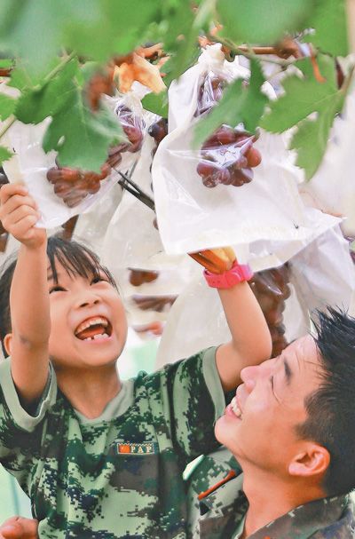 8月13日,江蘇省南京市溧水區(qū)白馬鎮(zhèn)的13名留守兒童來到江蘇省公安邊防總隊綜合保障基地農(nóng)場,體驗當一日小小“農(nóng)場主”。孩子們撿雞蛋、喂豬、摘葡萄,學習農(nóng)業(yè)相關知識,收獲勞動帶來的快樂。圖為當日,一名小女孩在邊防戰(zhàn)士的幫助下摘葡萄。