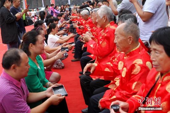 資料圖:86對(duì)老人聚集在一起圍成巨型同心圓慶祝金婚。中新社記者 王中舉 攝