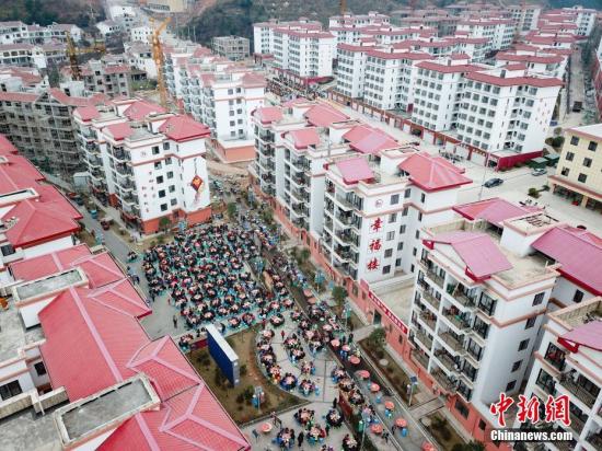 2月8日,航拍搬遷民眾在新家集體過小年。當(dāng)日,農(nóng)歷臘月二十三,正值中國農(nóng)歷小年,伴著難得的冬日暖陽,貴州省惠水縣明田易地搬遷扶貧安置區(qū)萬余名易地搬遷民眾聚在一起,載歌載舞、把盞言歡,共度新春佳節(jié)。 中新社記者 賀俊怡 攝
