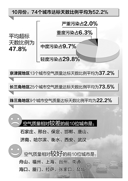 數(shù)據(jù)顯示,10月份,74個城市空氣質(zhì)量達(dá)標(biāo)天數(shù)比例平均為52.2%,有近一半城市達(dá)標(biāo)天數(shù)比例不足50%。平均超標(biāo)天數(shù)比例為47.8%,其中輕度污染占29.8%,中度污染占9.7%,重度污染占6.3%,嚴(yán)重污染占2.0%。與9月份相比,受秋冬季節(jié)轉(zhuǎn)換影響,主要污染物濃度中除臭氧外均有所上升,其中PM2.5、PM10濃度分別上升46.2%、39.6%。按照城市環(huán)境空氣質(zhì)量綜合指數(shù)評價,10月份空氣質(zhì)量相對較差的前10位城市分別是石家莊、邢臺、保定、邯鄲、唐山、濟(jì)南、哈爾濱、衡水、西安和武漢;空氣質(zhì)量相對較好的前10位城市是舟山、福州、上海、臺州、南通、?凇B門、拉薩、張家口和鹽城。