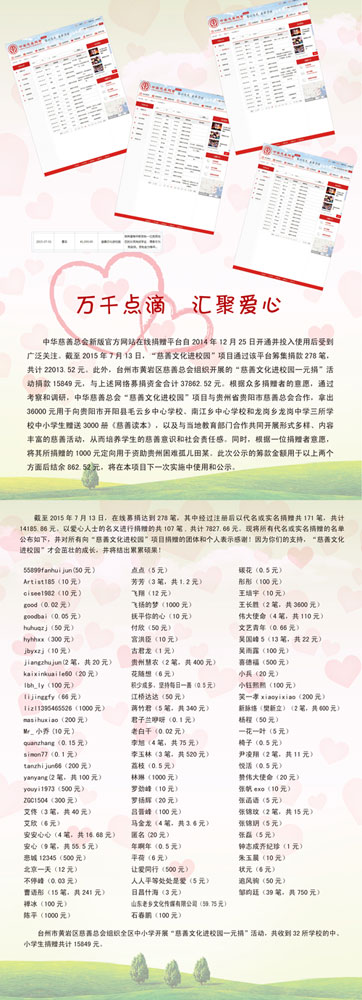 中華慈善總會新版官方網(wǎng)站在線捐贈平臺自2014年12月25日開通并投入使用后受到廣泛關(guān)注。截至2015年7月13日,“慈善文化進(jìn)校園”項(xiàng)目通過該平臺籌集捐款278筆,共計22013.52元。此外,臺州市黃巖區(qū)慈善總會組織開展的“慈善文化進(jìn)校園一元捐”活動捐款15849元,與上述網(wǎng)絡(luò)募捐資金合計37862.52元。根據(jù)眾多捐贈者的意愿,通過考察和調(diào)研,中華慈善總會“慈善文化進(jìn)校園”項(xiàng)目與貴州省貴陽市慈善總會合作,拿出36000元用于向貴陽市開陽縣毛云鄉(xiāng)中心學(xué)校、南江鄉(xiāng)中心學(xué)校和龍崗鄉(xiāng)龍崗中學(xué)三所學(xué)校中小學(xué)生贈送3000冊《慈善讀本》,以及與當(dāng)?shù)亟逃块T合作共同開展形式多樣、內(nèi)容豐富的慈善活動,從而培養(yǎng)學(xué)生的慈善意識和社會責(zé)任感。同時,根據(jù)一位捐贈者意愿,將其所捐贈的1000元定向用于資助貴州困難孤兒田某。此次公示的籌款金額用于以上兩個方面后結(jié)余862.52元,將在本項(xiàng)目下一次實(shí)施中使用和公示。