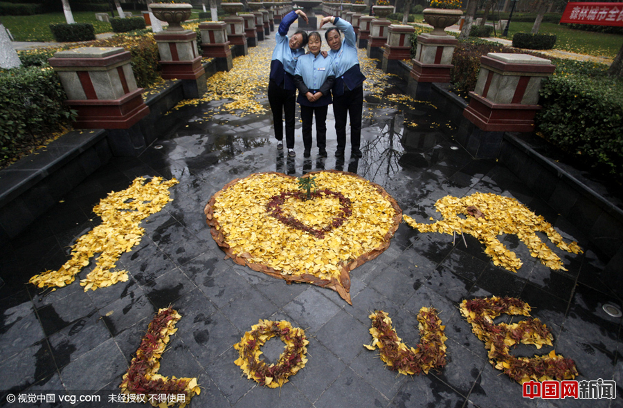 2015年11月20日,在西安市曲江一小區(qū)里幾處用銀杏葉拼出各種圖案受到小區(qū)業(yè)主的歡迎,業(yè)主紛紛伸出大拇指為拼出圖案的主人點(diǎn)贊。