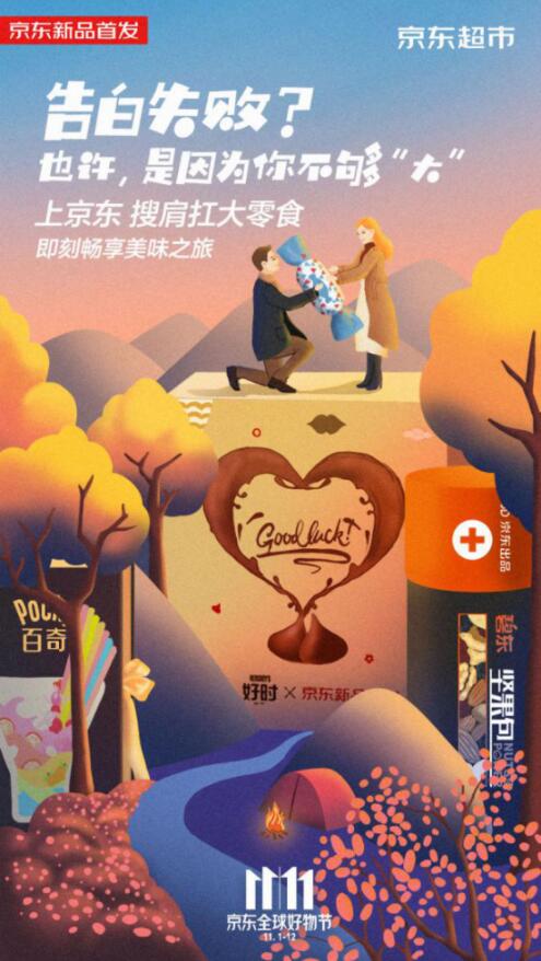在營銷同質(zhì)化嚴(yán)重的11.11節(jié)點(diǎn)下,品牌很難讓消費(fèi)者在眾多營銷活動(dòng)中感知到品牌信息,并對(duì)其產(chǎn)生影響。而在2018的11.11到來之際,京東超市通過“肩扛大零食”產(chǎn)品定制化玩法,以定制化產(chǎn)品、內(nèi)容營銷對(duì)話消費(fèi)者、線上線下聯(lián)動(dòng)持續(xù)發(fā)力三步走,成功抓住了消費(fèi)者眼球,在復(fù)雜的競爭環(huán)境中脫穎而出成為了今年11.11營銷大戰(zhàn)中的一支奇兵。