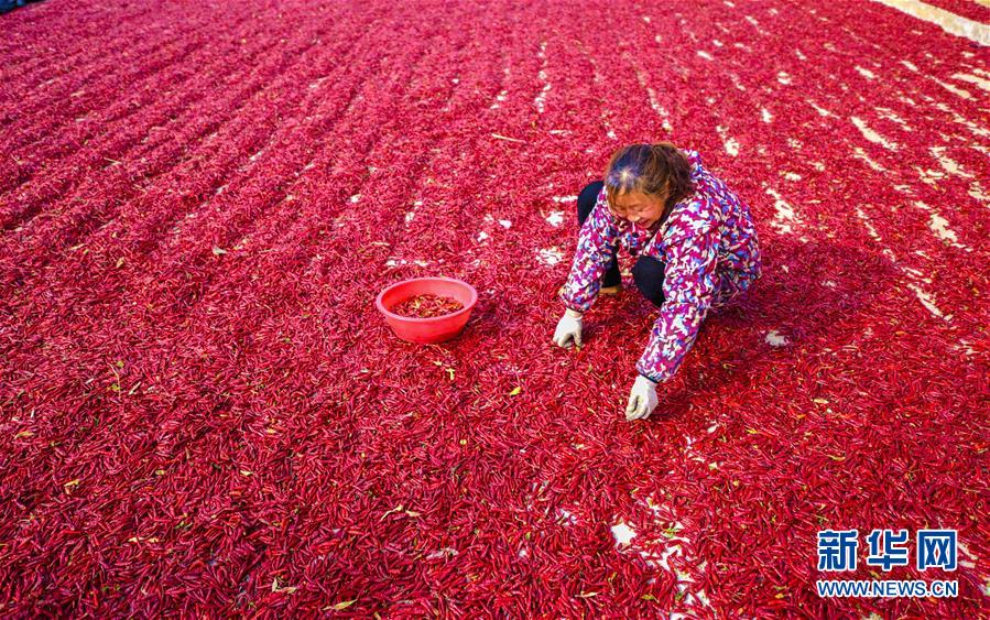 11月18日,在衡水市冀州區(qū)周村鎮(zhèn)辣椒加工交易基地,椒農(nóng)在對(duì)摘好的辣椒進(jìn)行二次篩選。