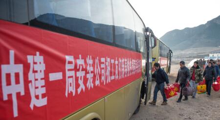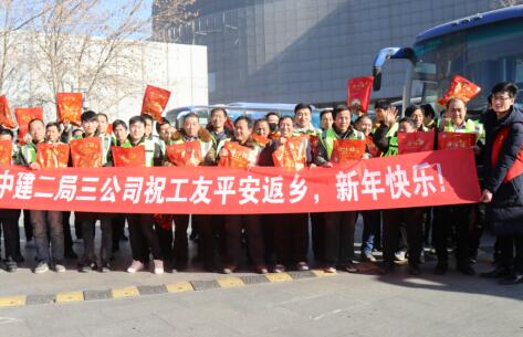 1月22日,中建二局三公司協(xié)助中華社會救助基金會,租賃”愛心大巴“送38名工友返鄉(xiāng),并為他們送上新春大禮包。大巴車從北京發(fā)車,將工友直接送回位于河北臨漳和河南安陽的老家。