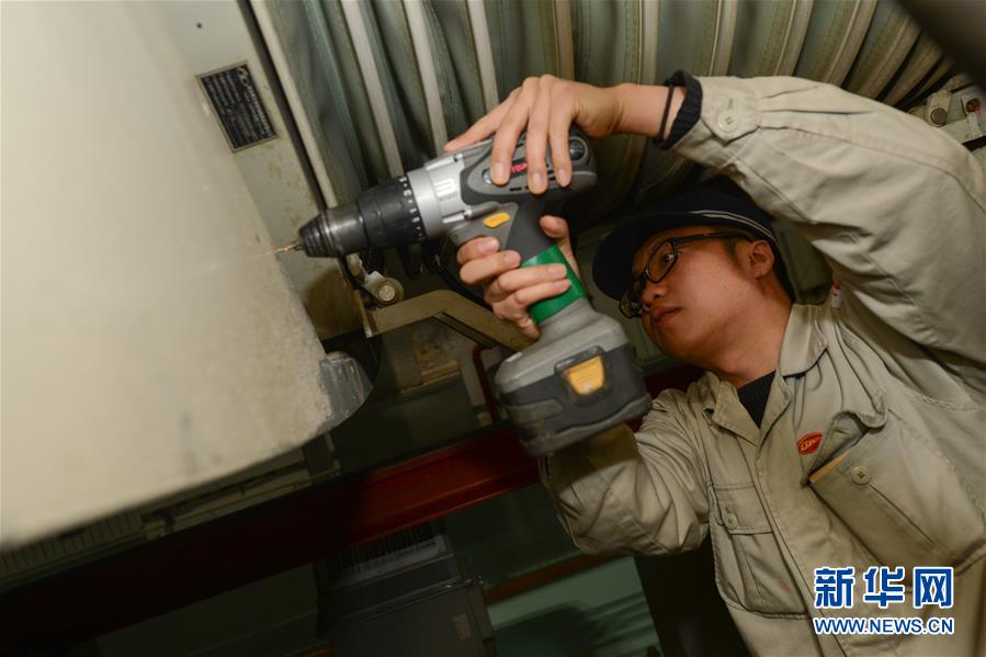地勤機(jī)械師邱紀(jì)盛在動(dòng)車組連接端對(duì)風(fēng)擋下方鉚接螺釘進(jìn)行重新安裝(2月19日攝)。