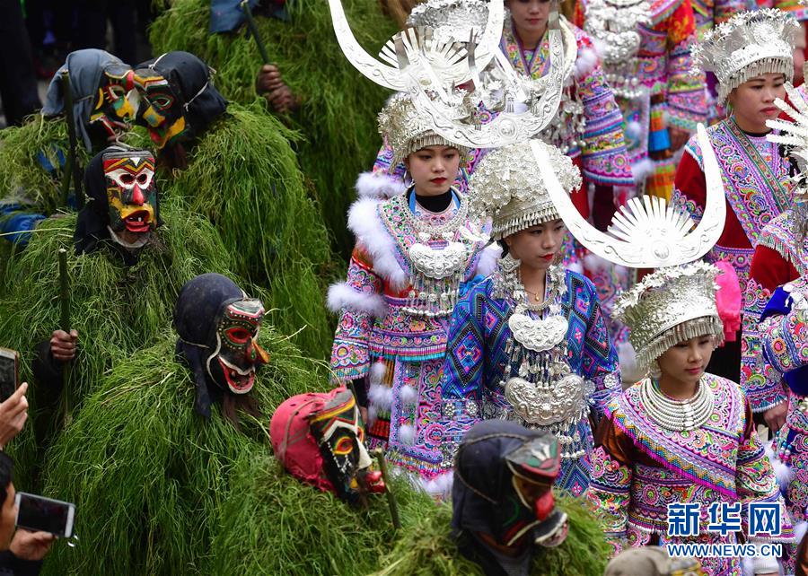 在廣西融水苗族自治縣安陲鄉(xiāng)“十七坡”現(xiàn)場(chǎng),苗族群眾跳芒蒿舞和蘆笙踩堂舞(2月21日攝)。