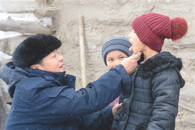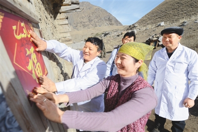 杰恩斯·阿里別克(左)為木尼拉·努爾一家貼上福字。
