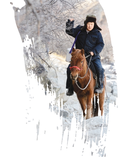 在昭蘇縣阿合牙孜冬季牧場,杰恩斯·阿里別克騎馬前往牧民家中巡診。