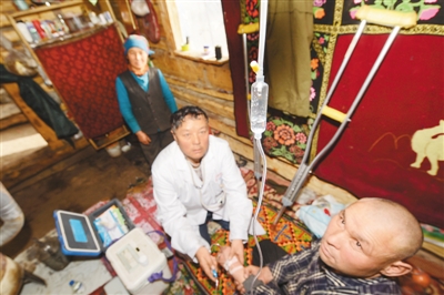 杰恩斯·阿里別克(中)在為牧民格敏·葉克巴依(右)打吊針。