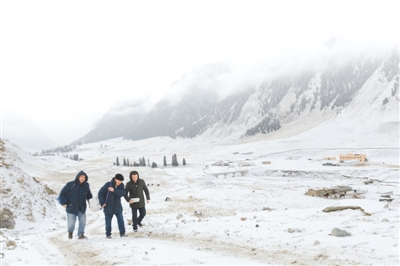 杰恩斯·阿里別克(中)帶領(lǐng)牧業(yè)醫(yī)院醫(yī)生在昭蘇縣阿合牙孜冬季牧場巡診。
