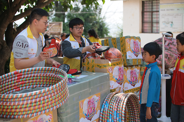 (志愿者給孩子們發(fā)放體育用品)