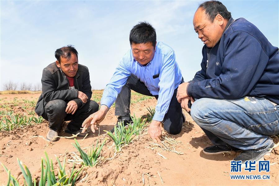 4月3日,在道勞呼都格嘎查,郭鴻嶂(中)在地里指導(dǎo)村民了解紅蔥生長(zhǎng)狀況。