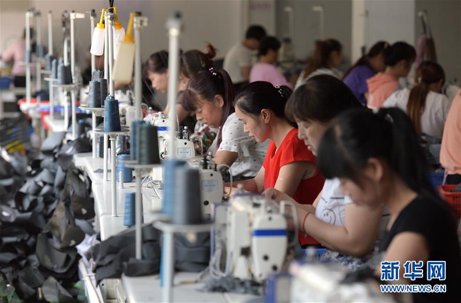 陜西省銅川市耀州區(qū)關(guān)莊鎮(zhèn)伊凱文箱包社區(qū)工廠內(nèi),來自周邊的村民在制作箱包(6月13日攝)。