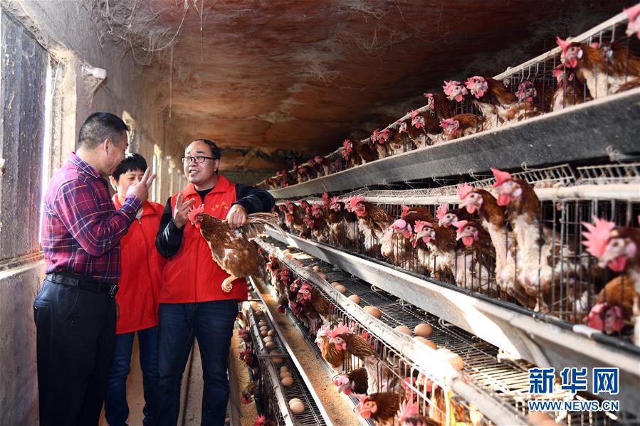 11月6日,在棗莊市臺兒莊區(qū)澗頭集鎮(zhèn)一養(yǎng)雞場,臺兒莊區(qū)畜牧水產(chǎn)科技扶貧服務(wù)隊(duì)的岳慶磊(右一)在向養(yǎng)殖戶傳授養(yǎng)雞知識。