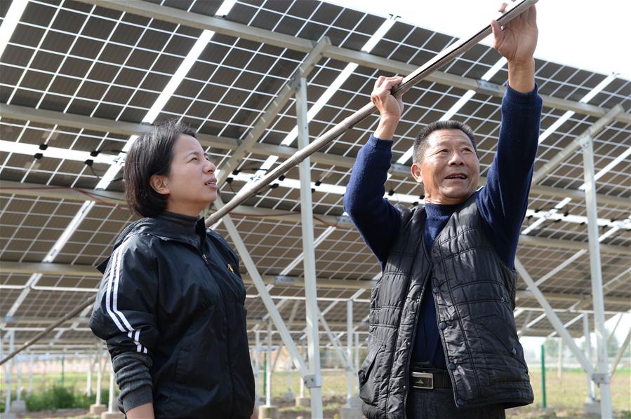 10月30日,劉雙燕(左)向光伏站的維護(hù)人員了解光伏站的運(yùn)行情況。