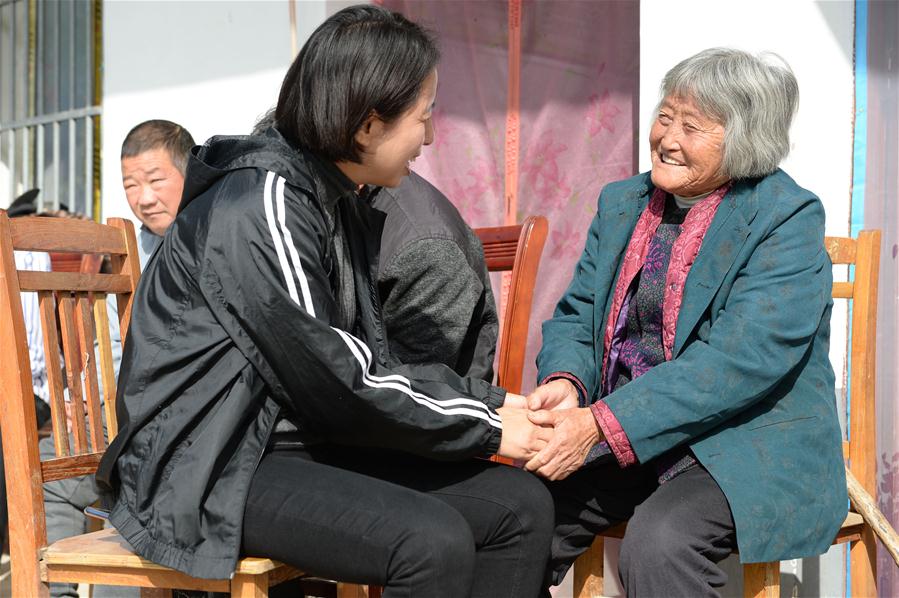 10月30日,劉雙燕(左)在利辛縣汝集鎮(zhèn)朱集村的養(yǎng)老院內(nèi)和老人交流。