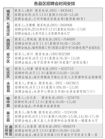央廣網(wǎng)蘭州8月8日消息 8月5日,蘭州市人社局發(fā)布《 2016年蘭州市引導(dǎo)高校畢業(yè)生進(jìn)企業(yè)服務(wù)雙向?qū)訉?chǎng)招聘會(huì)公告》 :蘭州市8個(gè)縣區(qū)及高新區(qū)將于近期舉辦引導(dǎo)高校畢業(yè)生進(jìn)企業(yè)服務(wù)雙向?qū)訉?chǎng)招聘活動(dòng),全市共有880名高校畢業(yè)生引導(dǎo)到各類企業(yè)服務(wù)。