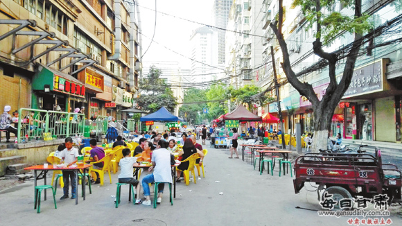 老酒泉路夜市逼仄的馬路上擺滿了桌椅。