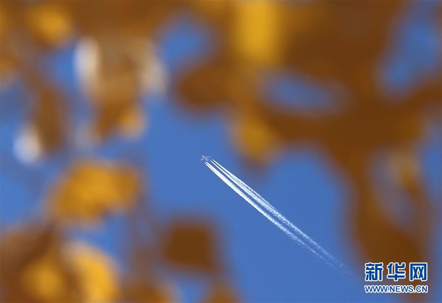 10月6日,一架飛機從甘肅省敦煌市莫高鎮(zhèn)的胡楊林上空飛過。新華社發(fā)(張曉亮 攝)