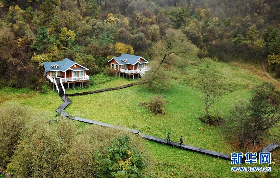 兩位游客漫步在云屏三峽自然風(fēng)景區(qū)木屋營(yíng)地的棧道上(10月18日無(wú)人機(jī)拍攝)。在秋意已濃的季節(jié),有著“天然氧吧”之稱(chēng)的甘肅省隴南市兩當(dāng)縣云屏三峽自然風(fēng)景區(qū)層林盡染,景色絢麗,多彩秋景讓人仿佛置身童話世界。新華社記者陳斌 攝 -