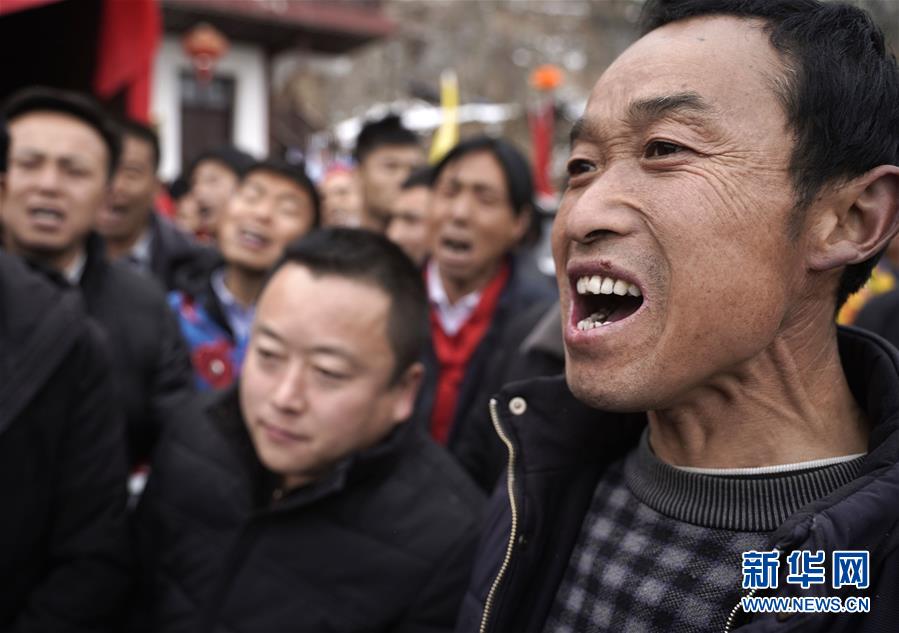 •      2月19日,在甘肅省隴南市武都區(qū)馬街鎮(zhèn)姜家山村,幾名男子在社火隊(duì)表演時(shí)大聲唱起當(dāng)?shù)氐母柚{。新華社記者才揚(yáng) 攝