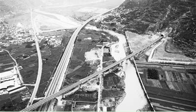 2016年,蘭渝鐵路隴南境內(nèi)漢王特大橋(右)與高速公路、國道立體交叉。新華社圖片