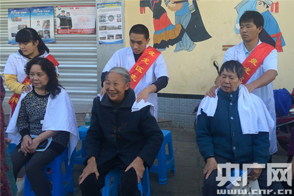 2015年11月7日,云南省昆明市盤龍區(qū)金星社區(qū)志愿者日,盲人按摩師志愿者在為老人按摩。