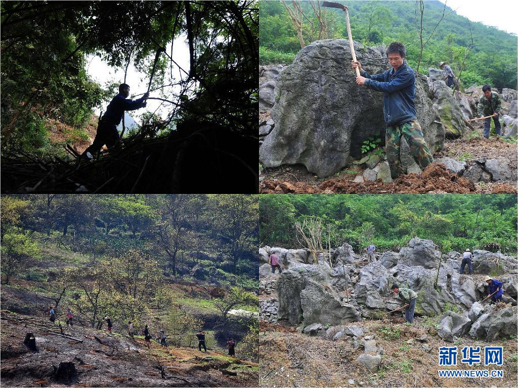 拼版照片:融安縣東起鄉(xiāng)銅板屯村民改造荒山。上左:銅板屯村民龍飛聯(lián)在山上砍雜草(2013年7月23日新華社記者黃孝邦攝);上右:銅板屯村民龍革雄在開墾荒地準備種植李子樹苗(2013年5月15日新華社記者黃孝邦攝);下左:銅板屯村民們上山開荒(2013年3月5日新華社記者黃孝邦攝);下右:銅板屯村民們在種樹(2013年5月15日新華社記者張愛林攝)。新華社發(fā)