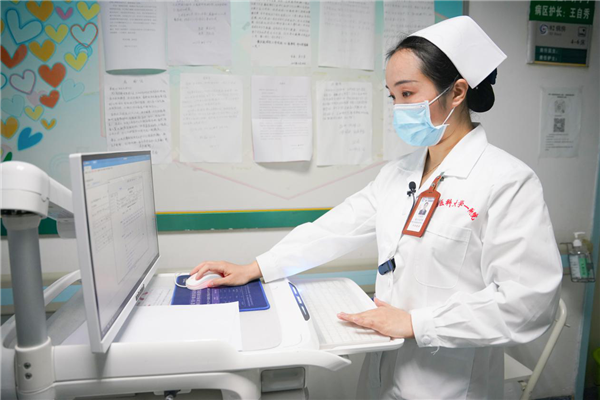 江淀淀在智能移動(dòng)護(hù)理站查看病人信息(央廣網(wǎng)發(fā) 尚天宇攝)